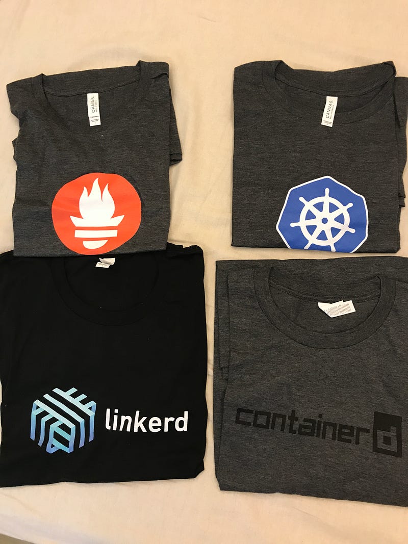 本來我也抱著只是玩玩的心態順便學習並沒有想要拿到什麼實體獎品,不過在我達到5000分的時候突然收到一封信,信中說感謝我的貢獻然後給了我50usd的credit讓我可以去CNCF的線上商店購物,然後重點是這個商店竟然是可以免費運送到台灣的!哈哈 於是我就買了好幾件Tshirt…(熟k8s或CNCF的人應該對下面幾個logo都非常熟悉吧)